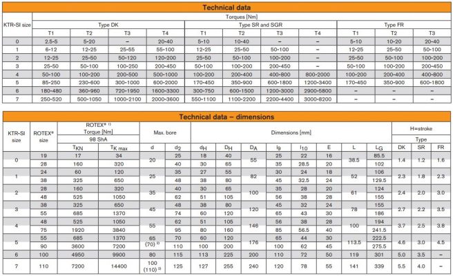Khớp nối quá tải KTR-SI là bộ giới hạn mô-men xoắn có sẵn trong nhiều loại khớp nối khác nhau (DK hoặc SR, tự động tham gia và tách tải FR, quay không tải) và thiết kế (khớp nối quá tải với loại mặt bích hoặc kết hợp với khớp nối hàm ROTEX).